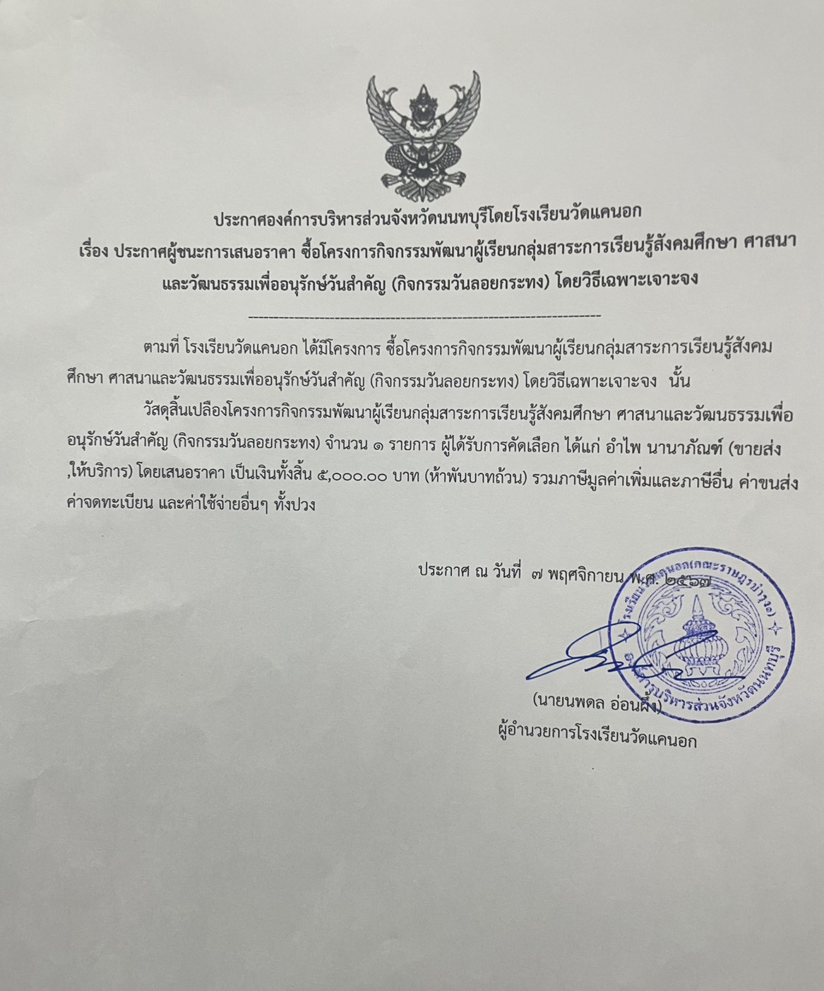 ประกาศผู้ชนะเสนอราคาโครงการกิจกรรม พัฒนาผู้เรียนกลุ่มสาระการเรียนรู้สังคมศึกษา ศาสนา และะวัฒนธรรม เพื่ออนุรักษ์วันสำคัญ(กิจกรรมวันลอยกระทง) โดยวิธีเฉพาะเจาะจง