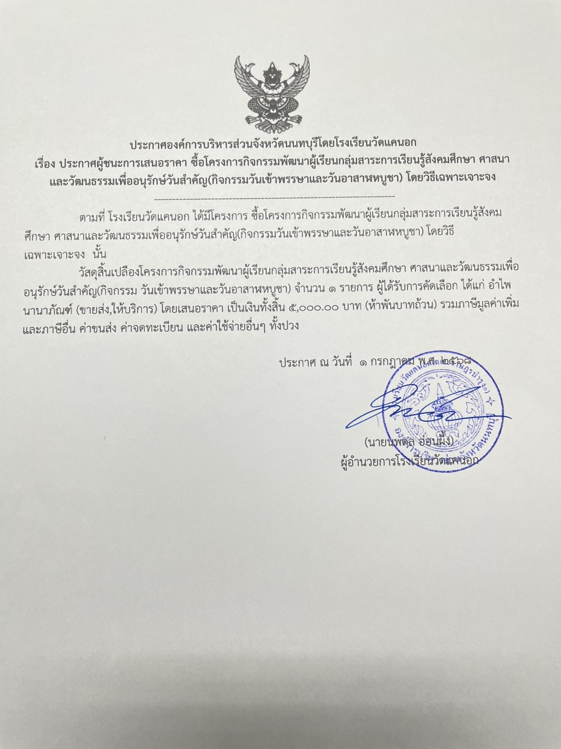 ประกาศเผยแพร่สาระสำคัญใบสั่งซื้อเลขที่ 25/2568 ลงวันที่ 1 กรกฎาคม 2568 ซื้ออุปกรณ์และวัสดุสิ้นเปลืองเพื่อใช้ในโครงการกิจกรรมพัฒนาผู้เรียนกลุ่มสาระการเรียนรู้สังคมศึกษา ศาสนา และวัฒนธรรมเพื่ออนุรักษ์วันสำคัญ(กิจกรรมวันเข้าพรรษาและวันอาสาฬหบูชา)