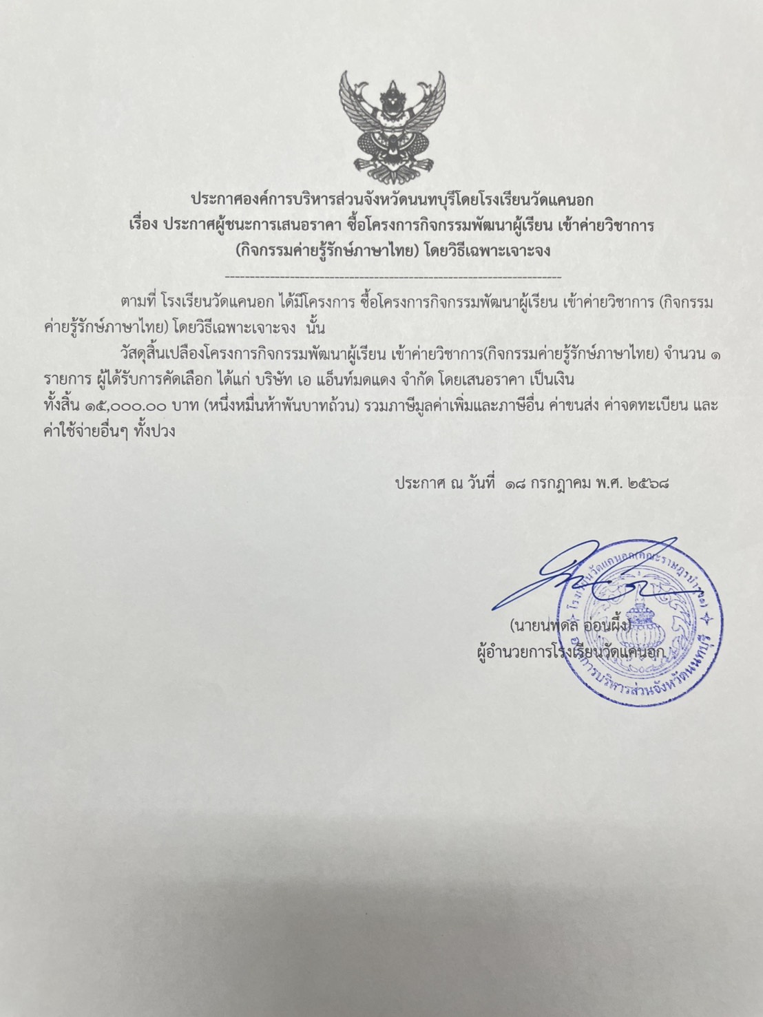 ประกาศเผยแพร่สาระสำคัญใบสั่งซื้อเลขที่ 28/2568 ลงวันที่ 18 กรกฎาคม 2568 ซื้ออุปกรณ์และวัสดุสิ้นเปลืองเพื่อใช้ในโครงการกิจกรรมพัฒนาผู้เรียน เข้าค่ายวิชาการ(กิจกรรมค่ายรู้รักษ์ภาษาไทย)