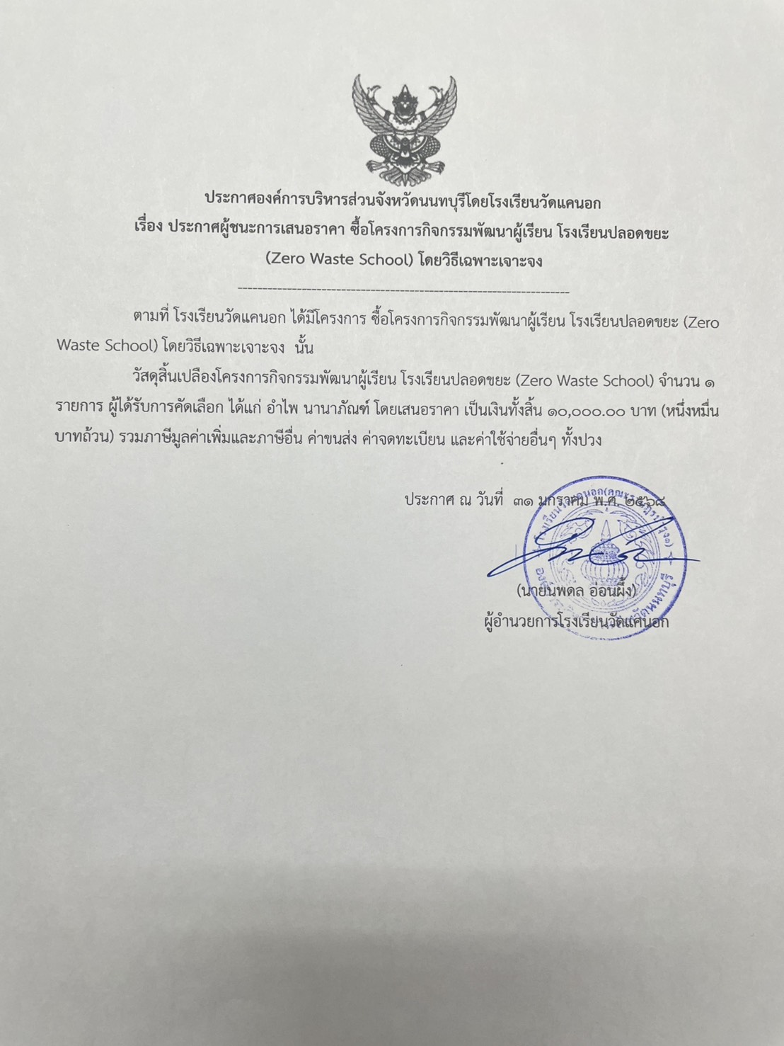 ประกาศผู้ชนะเสนอราคาโครงการกิจกรรมพัฒนาผู้เรียน โรงเรียนปลอดขยะ (Zero Waste School) โดยวิธีเฉพาะเจาะจง