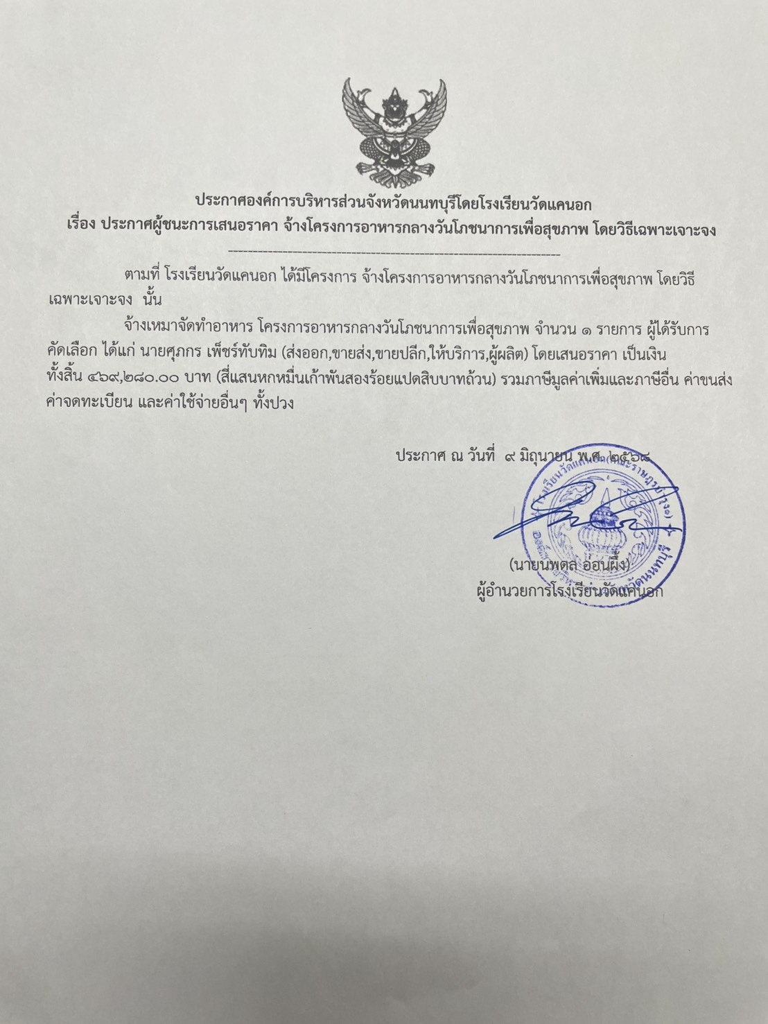 ประกาศเผยแพร่สาระสำคัญใบสั่งจ้างเลขที่ 6/2568 ลงวันที่ 9 มิถุนายน 2568 จ้างเหมาจัดทำอาหารกลางวันเพื่อใช้ในโครงการอาหารกลางวันโภชนาการเพื่อสุขภาพ