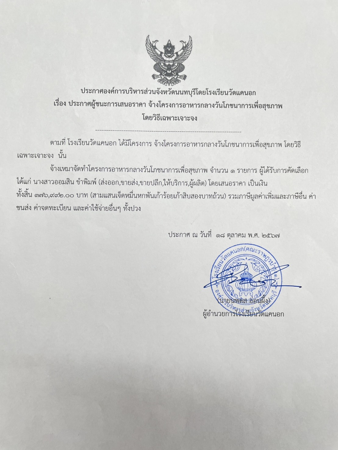 ประกาศเผยแพร่สาระสำคัญใบสั่งจ้างเลขที่ 1/2568 ลงวันที่ 18 ตุลาคม 2567 จ้างเหมาจัดทำโครงการอาหารกลางวันเพื่อใช้ในโครงการอาหารกลางวันโภชนาการเพื่อสุขภาพ