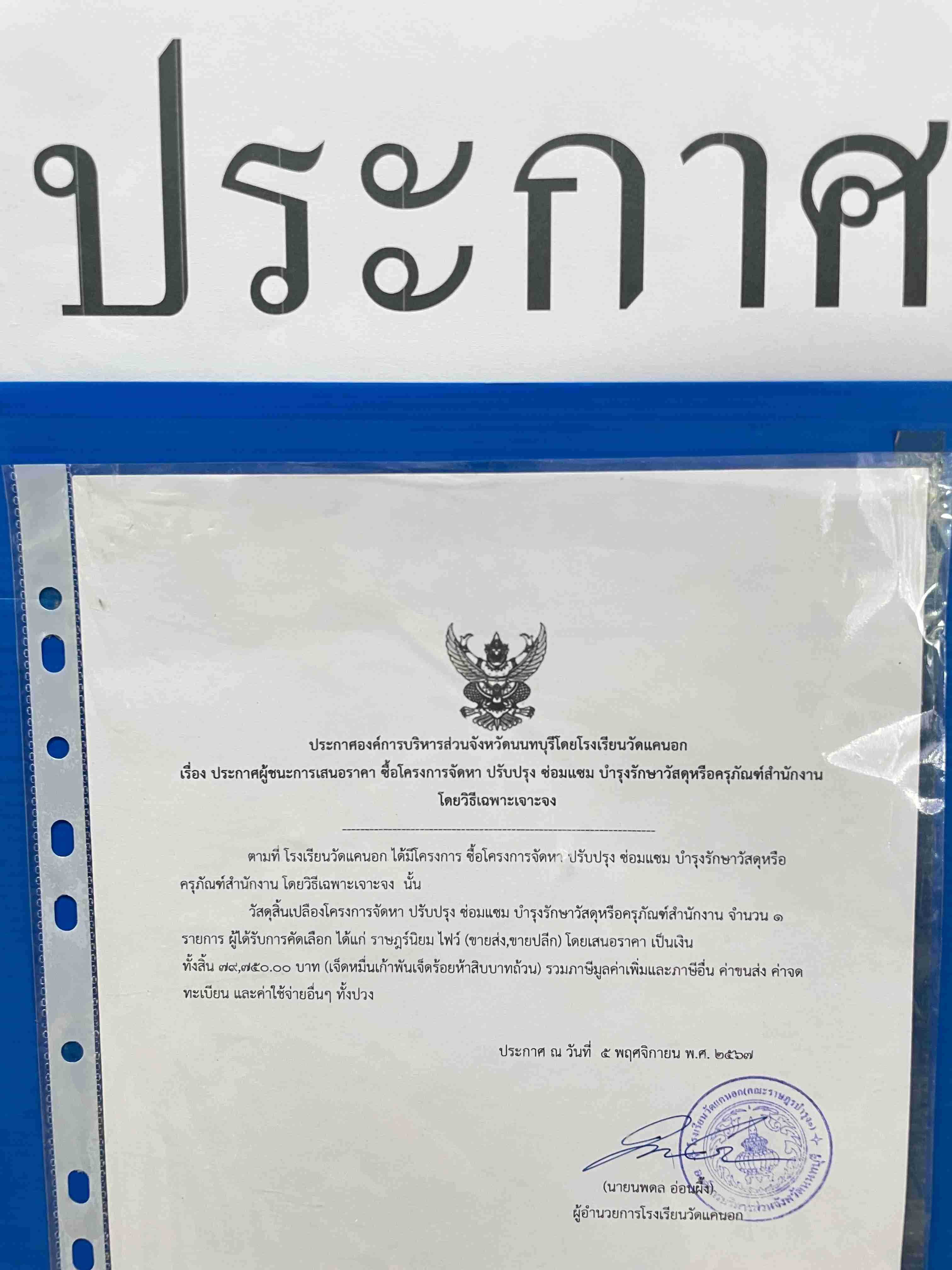 ประกาศผู้ชนะเสนอราคาโครงการจัดหา ปรับปรุง ซ่อมแซม บำรุงรักษาวัสดุหรือครุภัณฑ์สำนักงาน โดยวิธีเฉพาะเจาะจง