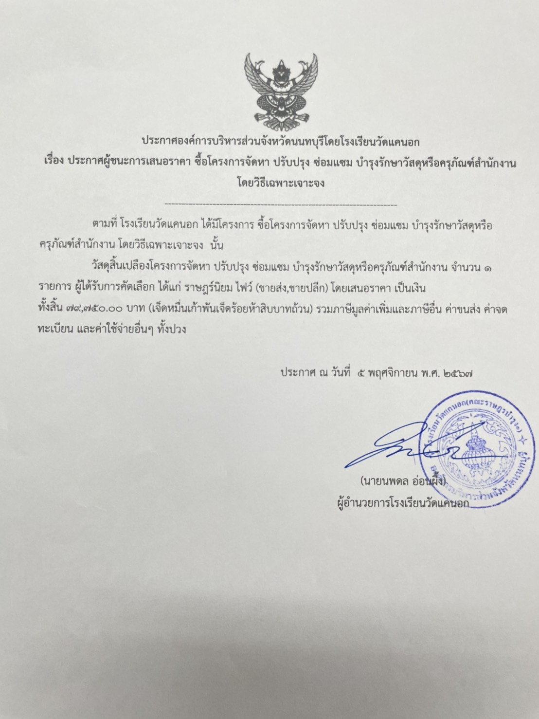 ประกาศเผยแพร่สาระสำคัญใบสั่งซื้อเลขที่ 1/2568 ลงวันที่ 5 พฤศจิกายน 2567 ซื้ออุปกรณ์และวัสดุสิ้นเปลืองเพื่อใช้ในโครงการจัดหา ปรับปรุง ซ่อมแซม บำรุงรักษาวัสดุหรือครุภัณฑ์สำนักงาน