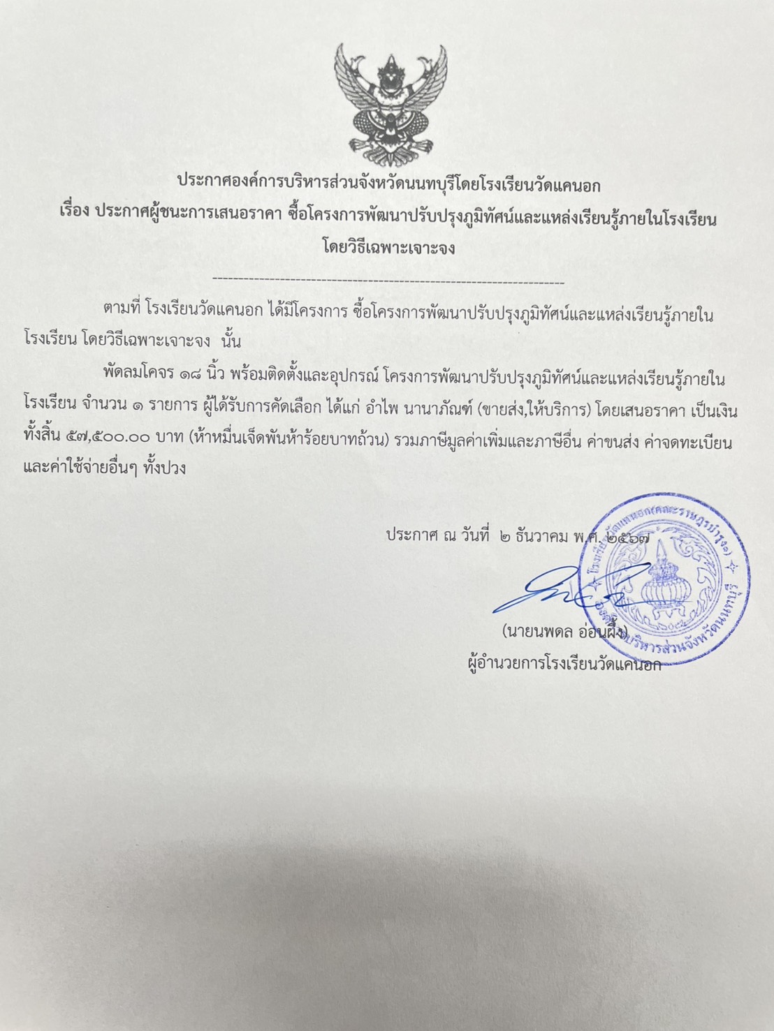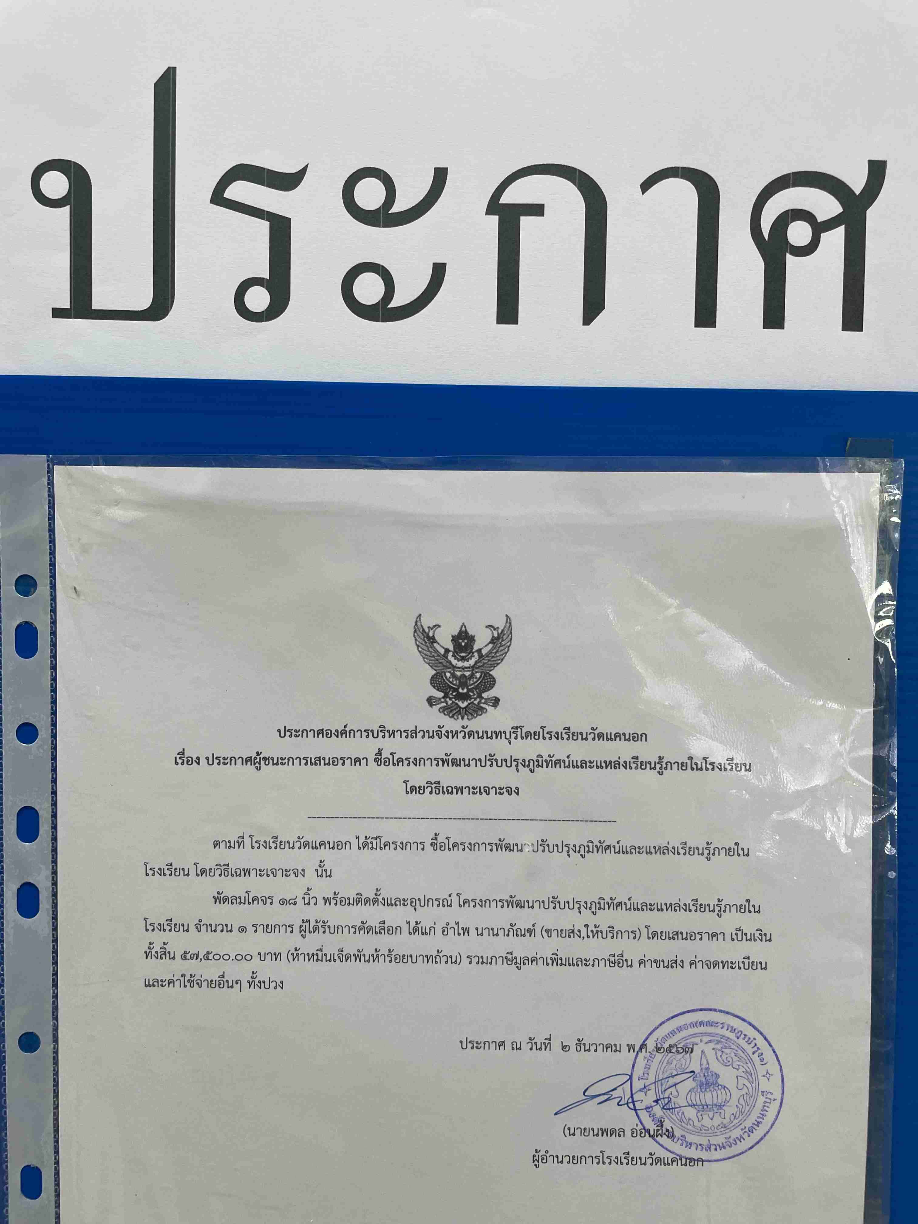ประกาศผู้ชนะเสนอราคาโครงการพัฒนาปรับปรุงภูมิทัศน์และแหล่งเรียนรู้ภายในโรงเรียน โดยวิธีเฉพาะเจาะจง