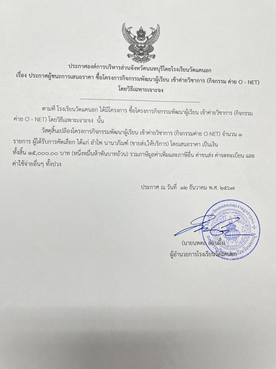 ประกาศผู้ชนะเสนอราคาโครงการกิจกรรมพัฒนาผู้เรียน เข้าค่ายวิชาการ (กิจกรรม ค่าย O-NET) โดยวิธีเฉพาะเจาะจง