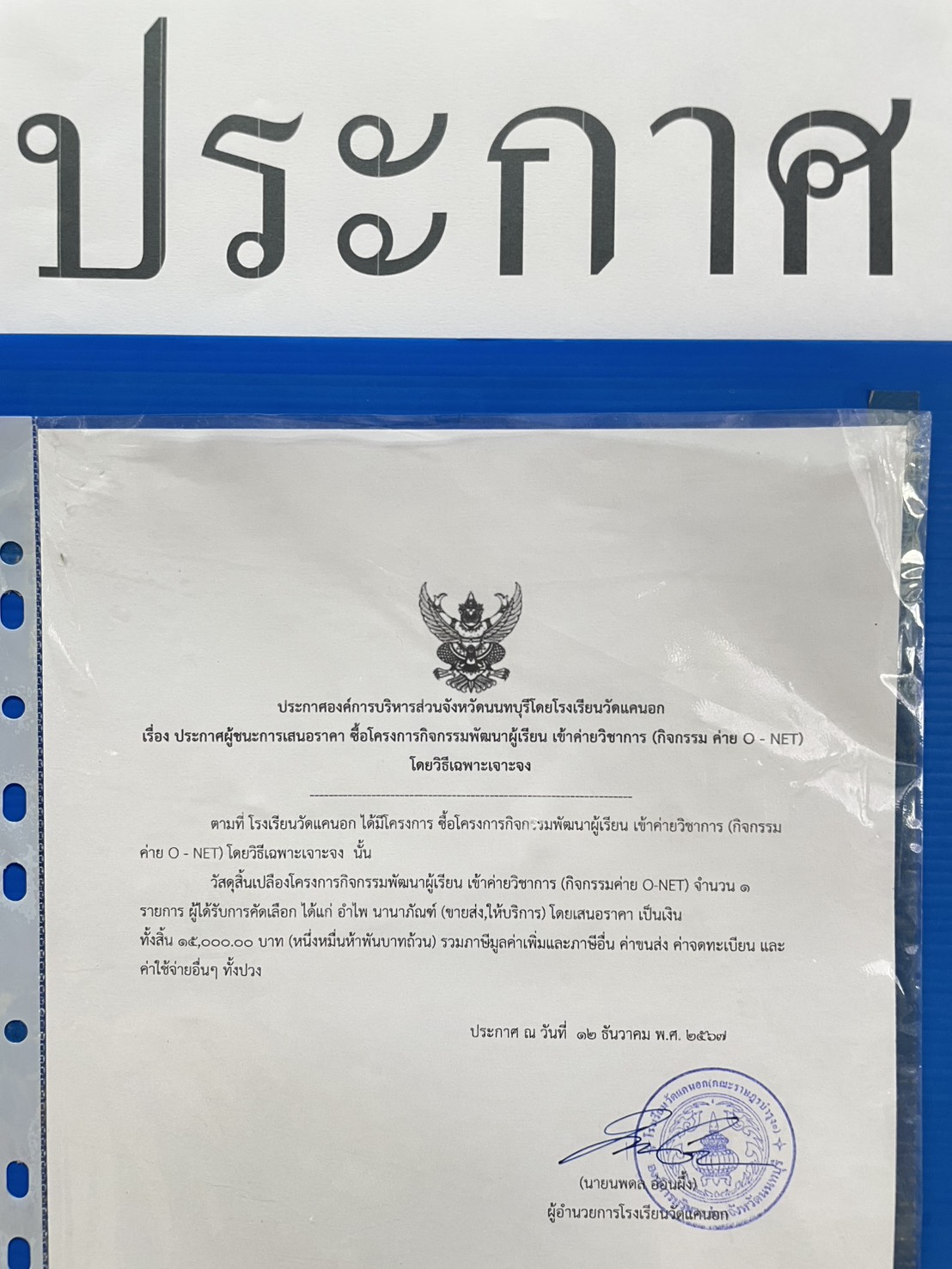 ประกาศเผยแพร่สาระสำคัญใบสั่งซื้อเลขที่ 8/2568 ลงวันที่ 12 ธันวาคม 2567 ซื้ออุปกรณ์และวัสดุสิ้นเปลืองเพื่อใช้ในโครงการกิจกรรมพัฒนาผู้เรียน เข้าค่ายวิชาการ (กิจกรรม ค่าย O-NET)