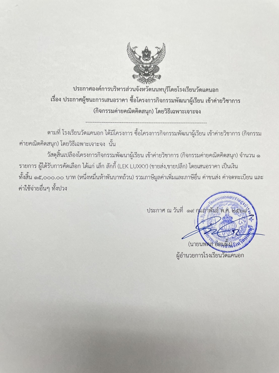 ประกาศผู้ชนะเสนอราคาโครงการกิจกรรมพัฒนาผู้เรียน เข้าค่ายวิชาการ(กิจกรรมค่ายคณิตคิดสนุก) โดยวิธีเฉพาะเจาะจง