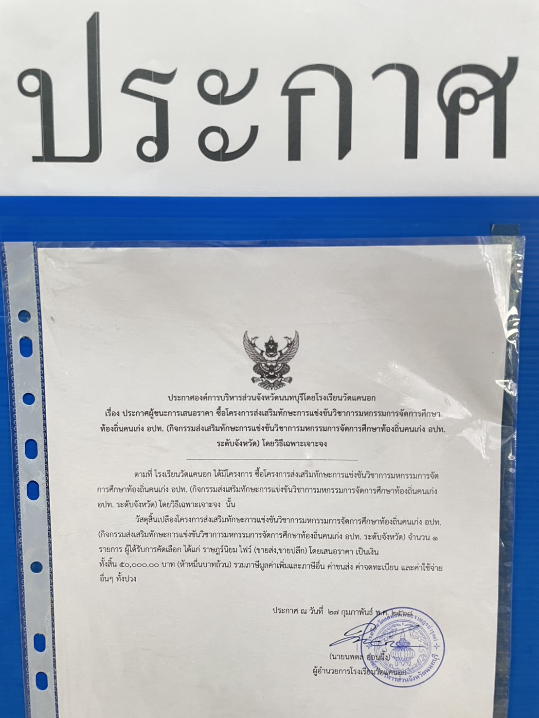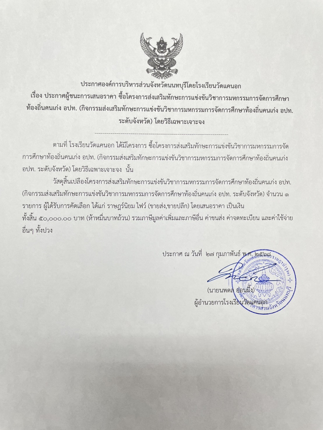 ประกาศผู้ชนะเสนอราคาโครงการส่งเสริมทักษะการแข่งขันวิชาการมหกรรมการจัดการศึกษาท้องถิ่นคนเก่ง อปท. (กิจกรรมส่งเสริมทักษะการแข่งขันวิชาการมหกรรมการจัดการศึกษาท้องถิ่นคนเก่ง อปท.ระดับจังหวัด) โดยวิธีเฉพาะเจาะจง