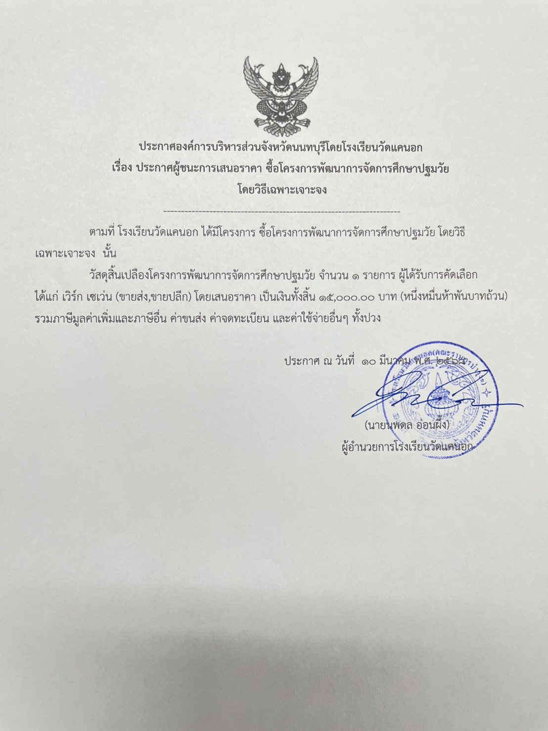 ประกาศเผยแพร่สาระสำคัญใบสั่งซื้อเลขที่ 16/2568 ลงวันที่ 10 มีนาคม 2568 ซื้ออุปกรณ์และวัสดุสิ้นเปลืองเพื่อใช้ในโครงการพัฒนาการจัดการศึกษาปฐมวัย
