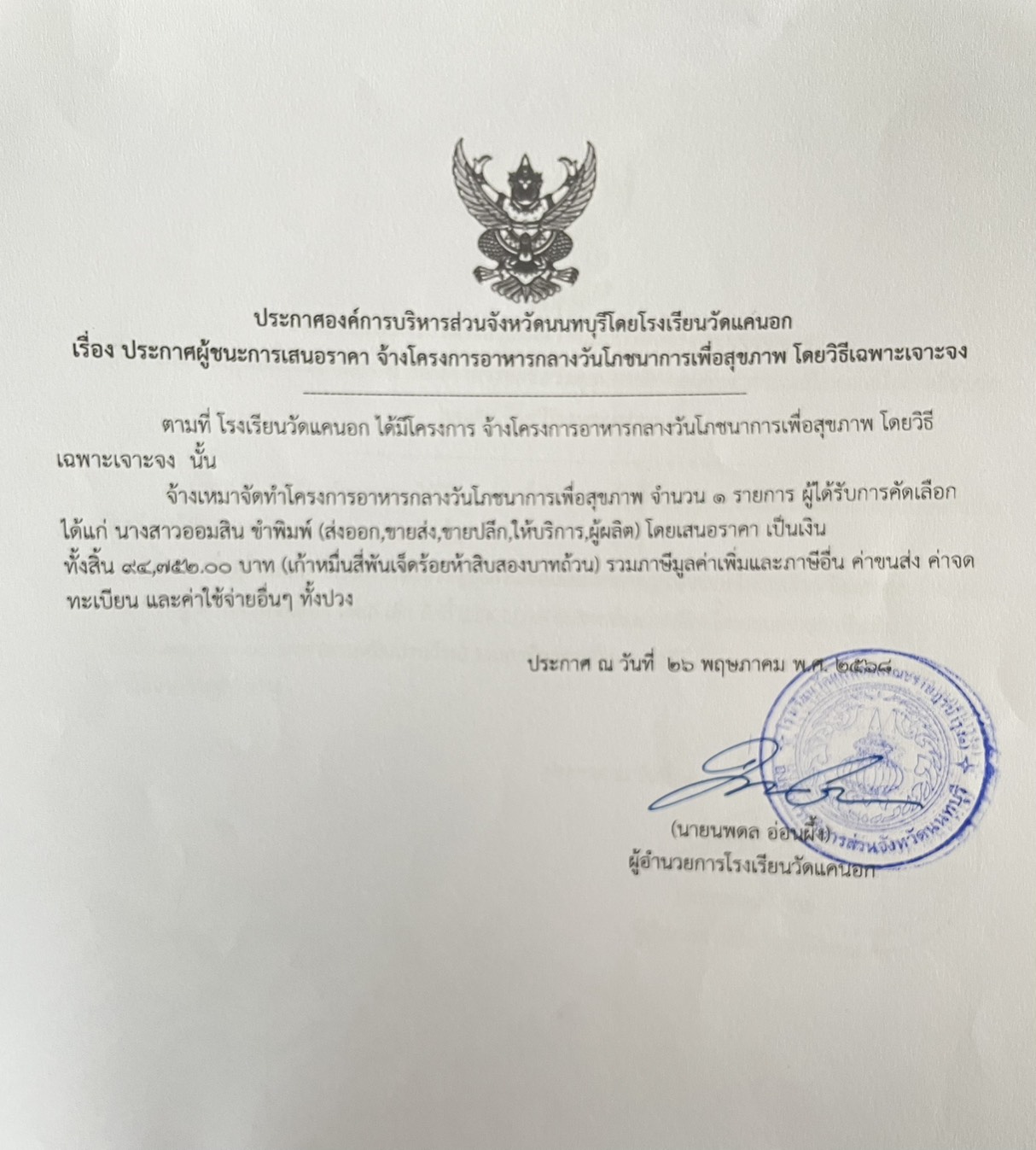 ประกาศผู้ชนะเสนอราคาโครงการอาหารกลางวันโภชนาการเพื่อสุขภาพ โดยวิธีเฉพาะเจาะจง