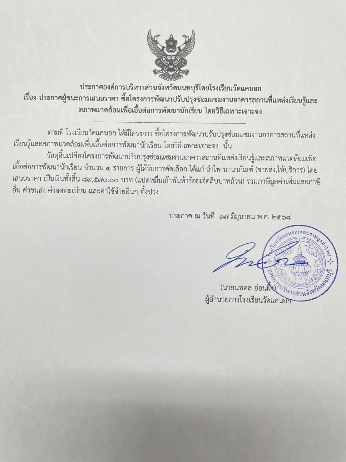 ประกาศเผยแพร่สาระสำคัญใบสั่งซื้อเลขที่ 22/2568 ลงวันที่ 17 มิถุนายน 2568 ซื้ออุปกรณ์และวัสดุสิ้นเปลืองเพื่อใช้ในโครงการพัฒนาปรับปรุงซ่อมแซมงานอาคารสถานที่แหล่งเรียนรู้และสภาพแวดล้อมเพื่อเอื้อต่อการพัฒนานักเรียน