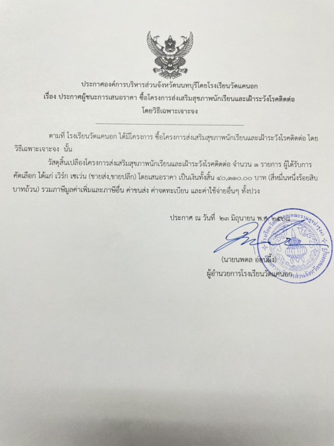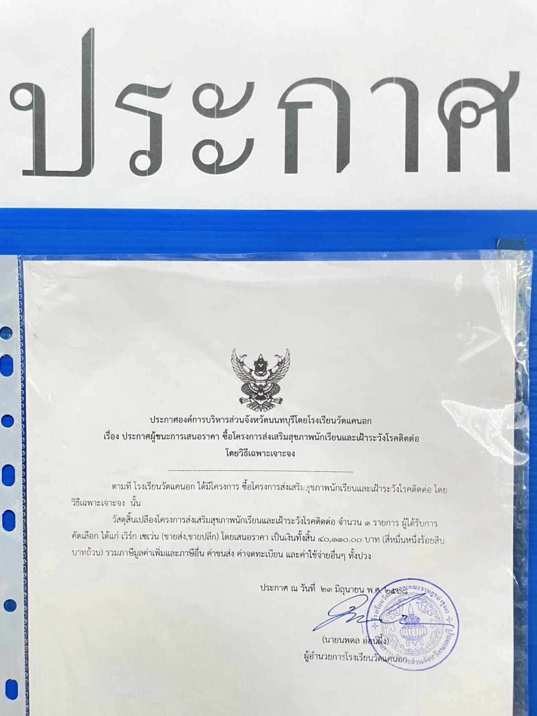 ประกาศเผยแพร่สาระสำคัญใบสั่งซื้อเลขที่ 24/2568 ลงวันที่ 23 มิถุนายน 2568 ซื้ออุปกรณ์และวัสดุสิ้นเปลืองเพื่อใช้ในโครงการส่งเสริมสุขภาพนักเรียนและเฝ้าระวังโรคติดต่อ