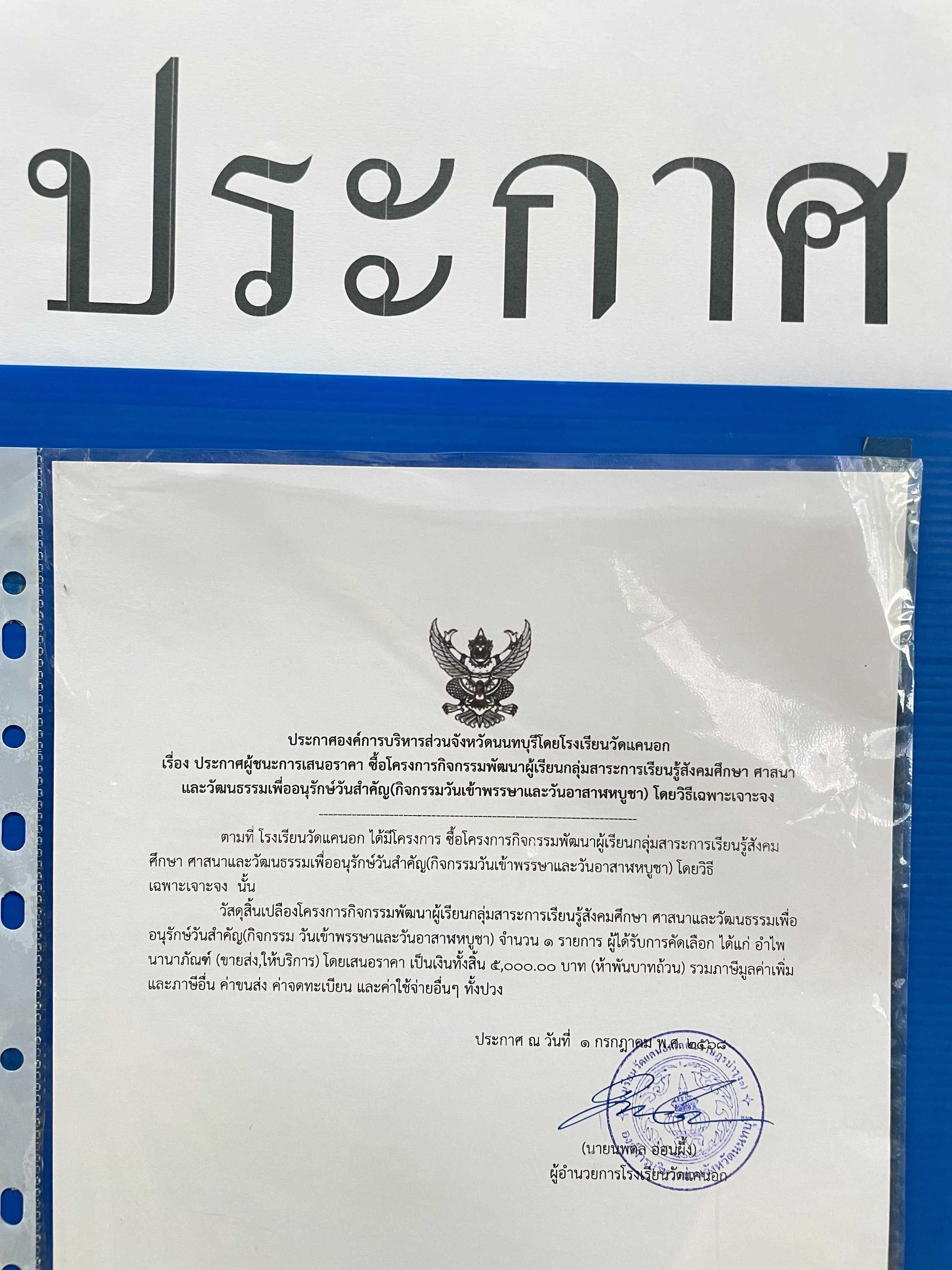 ประกาศผู้ชนะเสนอราคาโครงการกิจกรรมพัฒนาผู้เรียนกลุ่มสาระการเรียนรู้สังคมศึกษา ศาสนา และวัฒนธรรมเพื่ออนุรักษ์วันสำคัญ(กิจกรรมวันเข้าพรรษาและวันอาสาฬหบูชา) โดยวิธีเฉพาะเจาะจง