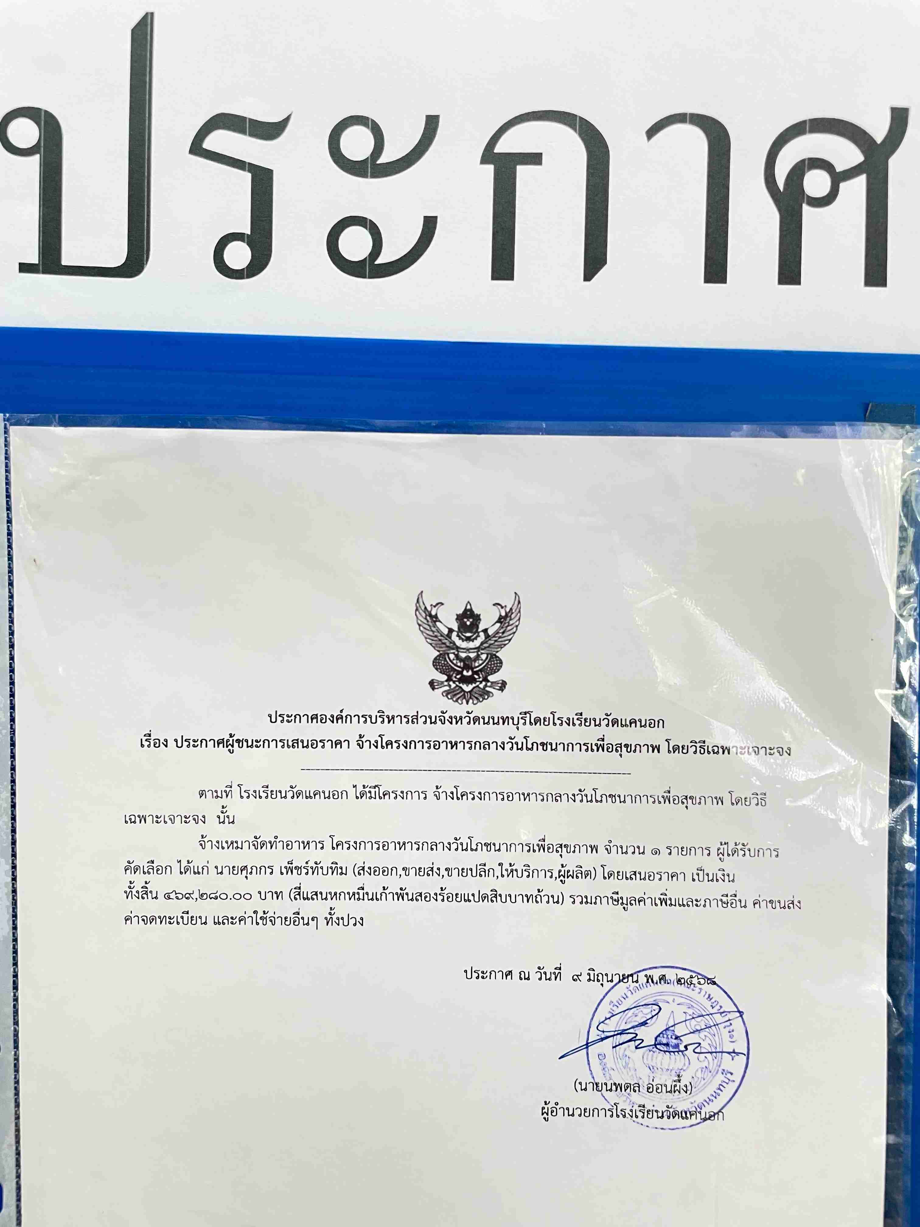 ประกาศผู้ชนะเสนอราคาโครงการอาหารกลางวันโภชนาการเพื่อสุขภาพ โดยวิธีเฉพาะเจาะจง